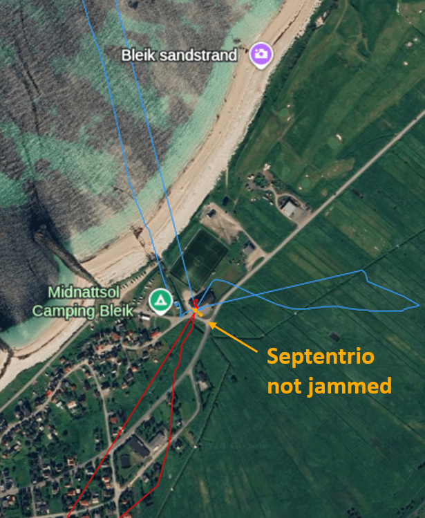 在挪威为期五天的赛事中,Septentrio接球手与多位竞赛接球手在各种干扰场景下进行了测试。这张图展示了一次静态测试,在极其强大的干扰条件下评估多个接收机——这些信号强度是GNSS信号的1000万倍。蓝线和红线代表两个竞争的接球手,由于干扰的影响,它们的定位相差数百米。相比之下,橙色显示的Septentrio接收机展现出对GPS/GNSS干扰的卓越韧性。它始终提供准确的GNSS定位,同时主动探测并发出干扰信号。