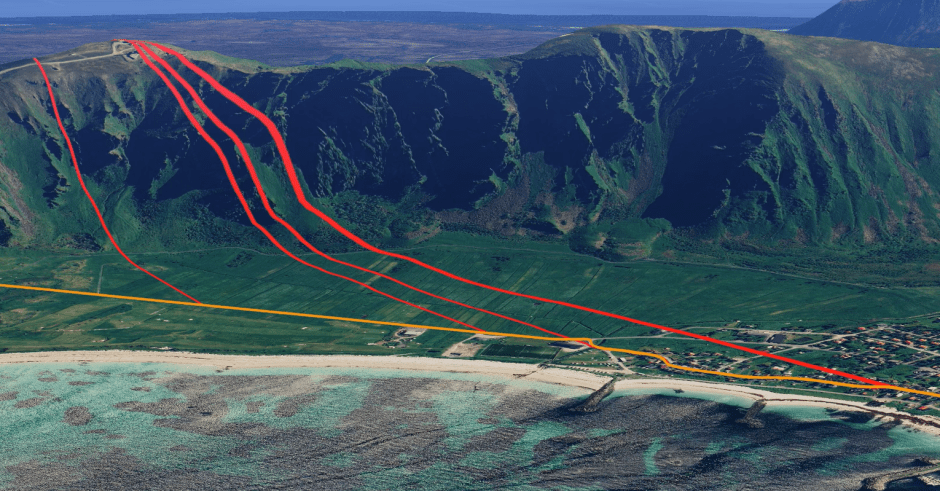 在挪威JammerTest 23的一次实时欺骗攻击中,一辆车内的Septentrio接收机在海岸公路(每张图片中为橙色轨道)保持在轨道上,而竞争对手的接收机(蓝色、绿色、红色轨道)则被伪装并显示错误位置。