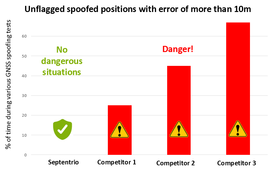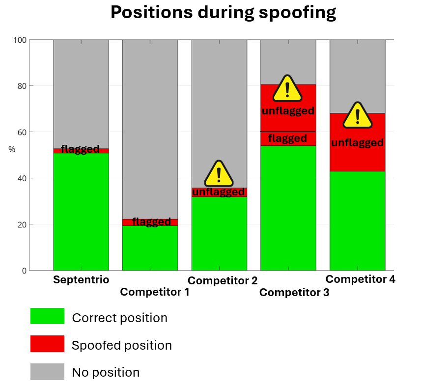在挪威的多次实时欺骗测试中,从多个接收器收集了数天内大量数据。下图显示,与竞争对手不同,Septentrio接收器能够持续检测并标记各种类型的伪装,并标记所有伪装可能导致重大定位错误的情况。伪造将系统“放置在”远离真实位置的位置尤其危险,因为可能导致碰撞、系统损坏或危及旁观者安全。