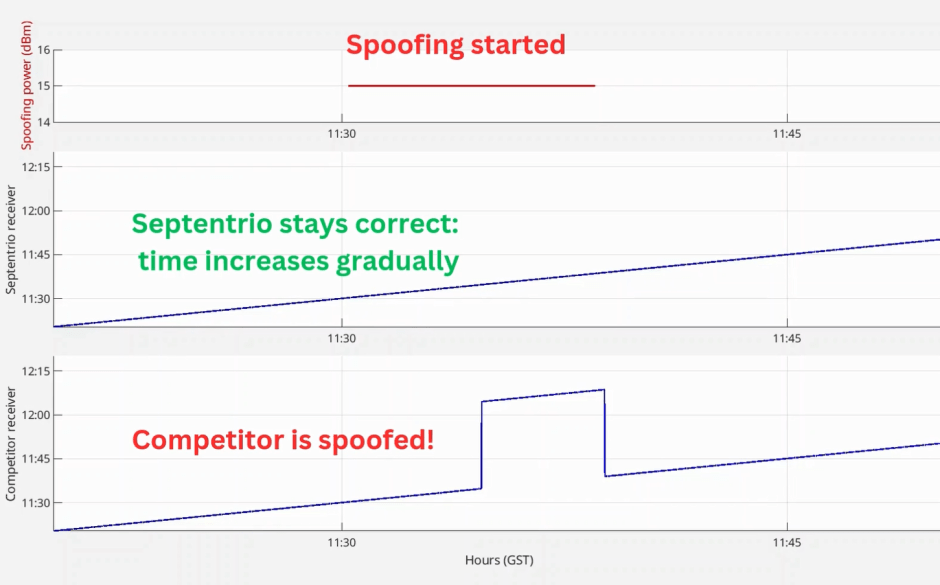 下图显示了一次被伪造GNSS时间的测试结果。Septentrio接收机保持了准确的时序,而竞争对手的接收机则被伪造并显示错误的时间。电信、电网和金融机构等应用依赖于精确的GNSS时序。恶意伪装可能导致停机,总损失高达数百万美元或欧元。投资于具备韧性的GNSS技术对于保护关键任务系统及其依赖用户至关重要。