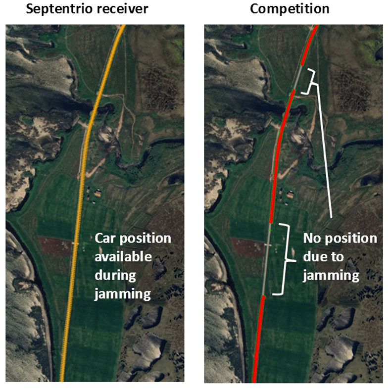 图1 在实时GNSS干扰中,测试车上的Septentrio接收器可以提供准确的定位,而竞争者的接收器在一段时间后会失去定位。