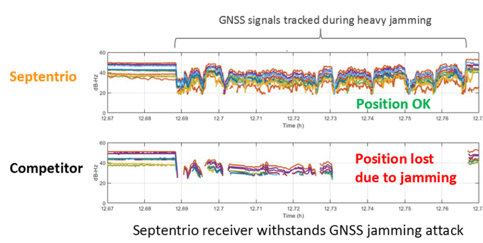 图3:随着GNSS信号开始扰,其质量下降,如信噪比图所示。Septentrio接收机负责跟踪和定位,而竞赛接收机则在一段时间内失去定位。